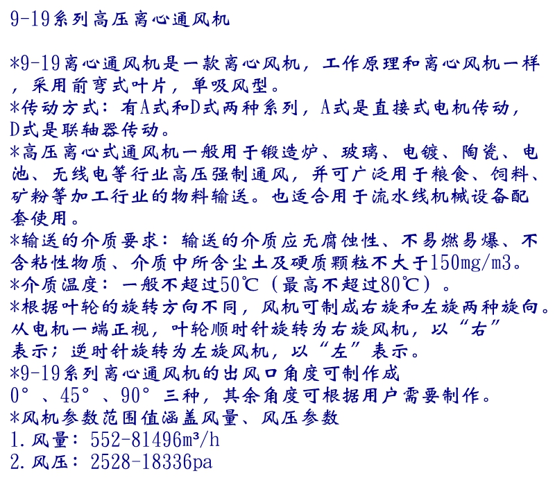 高壓離心式通風機一般用于鍛造爐、玻璃、電鍍、陶瓷、電池、無線電等行業高壓強制通風,并可廣泛用于糧食、飼料、礦粉等加工行業的物料輸送。